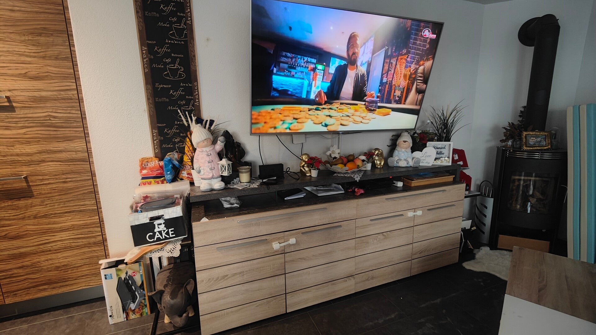 Ici, nous avons modifié un salon, installation d'un meuble suspendu fournis par le client. Nous avons récupérer l'ancien meuble pour créer une étagère sur mesure afin d'entreposer divers accessoires accessible directement depuis la cuisine. La prochaine étape proposée, est de créer un bardage en chêne massif coté salon afin de relier le décor du meuble suspendu à l'étagère fabriquée.
